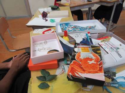 新聞や雑誌記事などから、自分の好きだと感じたところを切り抜き(スクラップ)していき、自分だけの箱を作るということを、2時間の授業時間を通して、行いました。