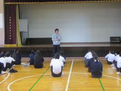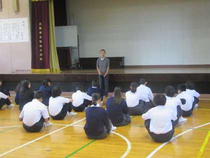 一つ目は、藤澤先生のお話です。先生は、「大人って何だろう?と昨日家で話をしていました。大人とは他人のために何か行動できる人をいうのじゃないか? 自分をよく見てもらおうと他人のために行動するのは、まだ大人とは言えないのでは?」など、ご家族の会話を紹介しつつ、生徒たちに「みんなはまだ10代前半、これからたくさんの経験を積みながら、素敵な大人になってください。」と話されていました。