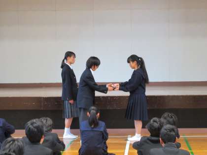 続いて、学級委員会より「チャイム着席」月間最優秀クラス、「宿題ファイル提出」最優秀クラスの発表と表彰がありました。