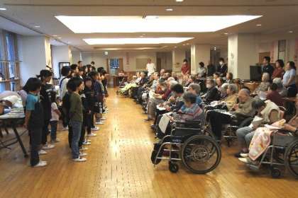 子どもたちの合奏、合唱で入所者のおじいさん、おばあさんに喜んでもらう行事です。