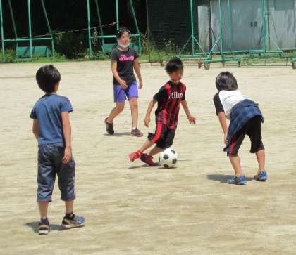 今週6月15日(月)から通常授業が始まり、昼休みの運動場でのリクレーションも始まりました。多くの小学生,中学生に加え小・中の教職員も入り混じって、元気に歓声を上げて楽しんでいました。熱中症防止の観点ら、他の人と2m以上離れることを条件にマスクを外すことも認められ、のびのびとスポーツを楽しんでいました。