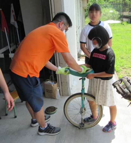 ボールなどの用具も以前と同様に貸し出されましたが、その消毒作業のため予鈴の5分前に返却することになりました。時刻が来ると、教員の呼びかけで、どの児童・生徒も一斉に倉庫まで返却に来ており、いつまでも遊んでいる人はいませんでした。
