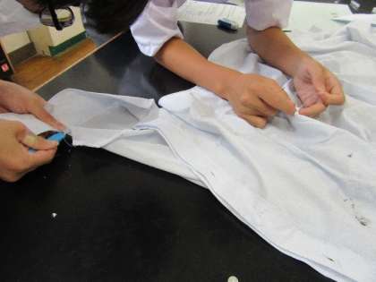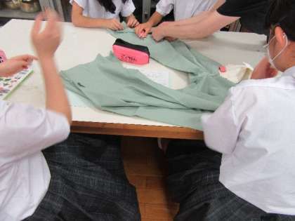 中学1年生の家庭科の授業の様子です。中学校の家庭科では衣、食、住だけでなく保育や消費生活と幅広く学習します。現在、1年生は衣服の単元を学習中です。今日の授業は「衣服の構成を知ろう」ということで、古着を分解してパーツに分けてみました。「洋服ってこうやって縫製されているのか!」どの生徒も興味深く取り組んでいました。