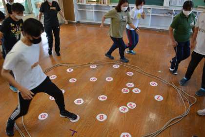 写真1:講師の先生方  写真2:番号踏みゲーム