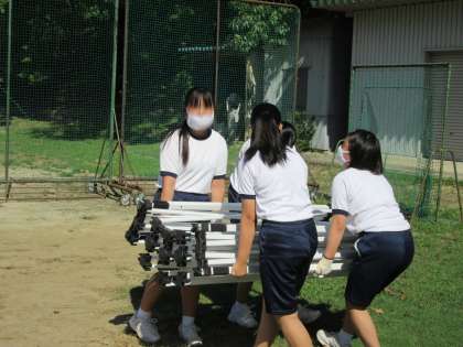 運動会が近づいてきた今日9月8日、練習時の日差しを軽減して熱中症を防ぐため、中学生と職員でテントを7基組み立てました。昨年までは男子だけで組み立てていましたが、今年は女子から「私たちも運動会の準備で何かお手伝いをしたい」と申し出があり、中学生全員で行うことになりました。