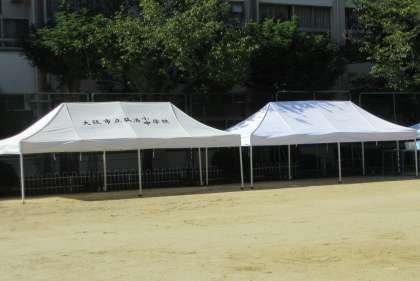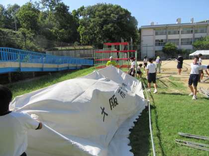 みんな、教員の指示のもと、自ら仕事を探して積極的にかかわり、30分程で7基のテントが組み上がりました。