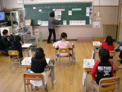 平成26年12月10日(水) 小学校3年で研究授業がありました。教科は理科、単元は「電気であかりをつけよう」です。この日の学習は、電気を通すものをさがすという内容です。金属、木、プラスチック、紙などいろいろなものを回路の途中にはさんで豆電球がつくかを実験しました。こどもたちは意欲的に学習に取り組むことができました。