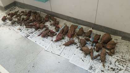 1枚目の写真は、先日、3年生が本校の畑から収穫してくれたサツマイモです。すごい数です!!そして、2枚目の写真のように、特大サイズのものも!!