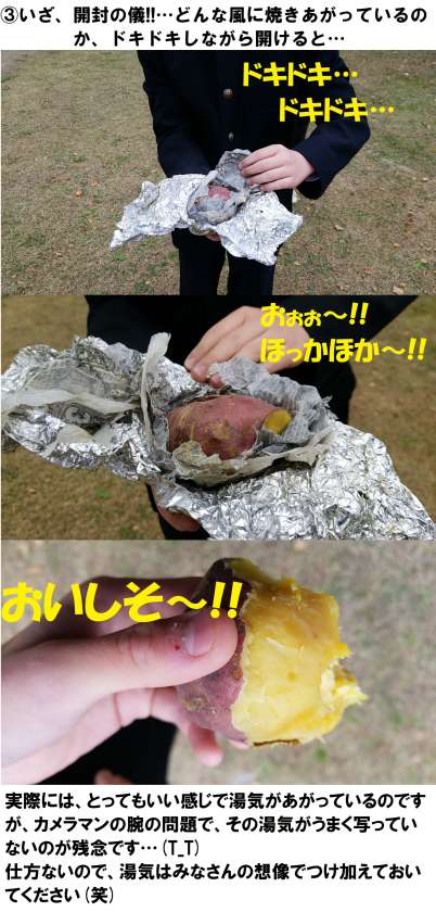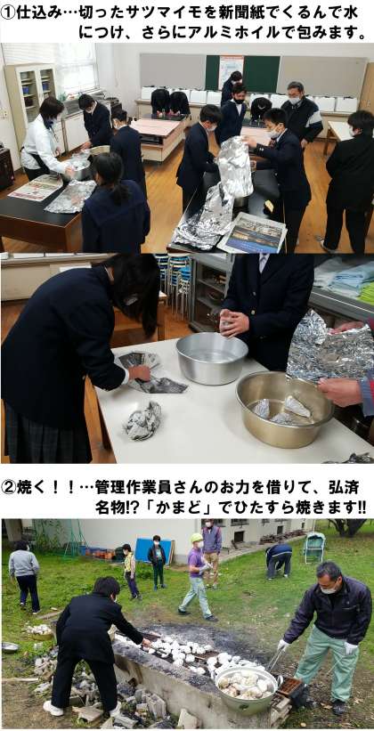 本校には、大きな畑があり、さまざまな収穫物があるのですが、先月、その畑でサツマイモが収穫できました。そのサツマイモを、本校自慢の「かまど」で焼いて、生徒・教職員のみんなでおいしく…というのが、「焼き芋大会」です。給食前に仕込んでおいて、放課後にみんなでいただきました。