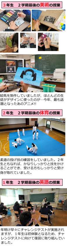 そして授業では、2学期もラスト3日ということで、2学期最後の授業となる教科が多くなってきました。今回はその中から、いくつかの授業の様子を紹介したいと思います。下の写真をご覧ください。