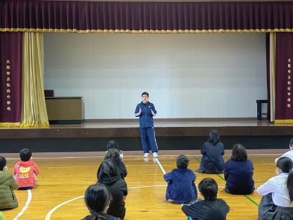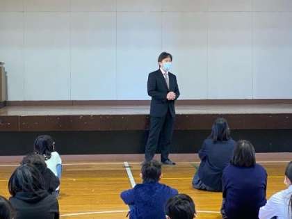 「お昼休みに、いろんな年齢の子どもたちが仲良く遊んでいるのは、弘済小・中学校の特色です。球技を教え合ったりする微笑ましい姿を見かけるときもあるけれど、最近の様子はどうだろう? 中学生は、先輩としてしっかり面倒をみてやってほしい。そして、小学生はお兄ちゃんお姉ちゃんのいいところをいっぱい吸収してほしい。先生たちは、学校がそんな場所であってほしいと思っています。」とお話されました。