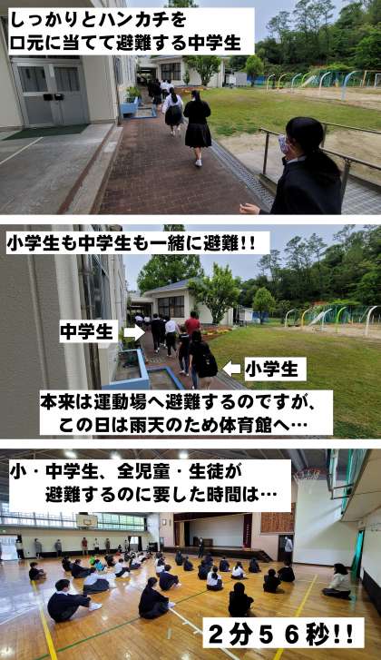 本校は、小・中学校であるため、小学1年生〜中学3年生まで、実に9学年の児童・生徒が在籍しています。判断力・理解力、あるいは歩く速さなど、発達段階によってかなり大きな差があるため、児童・生徒(もちろん教職員もですが)全員がこのような訓練に真剣に取り組み、しっかりとシミュレーションしておくことがとても重要になってきます。