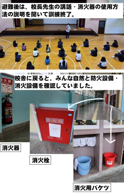 避難完了後は、校長先生から講評・講話をいただき、担当の先生から消火器の使い方についての説明を受けて訓練は終了となりましたが、校舎に戻ってからも、消火器や消火栓の場所を確認するなど、みんなさっそく訓練の意義を感じさせる動きを見せてくれていました!!