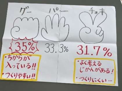 橋本先生からはじゃんけんの勝率を上げる方法について。みんなの“運命”をかえてしまう【じゃんけん】。『日本じゃんけん協会』のHPによると、「感情的になっていたり、力が入っていたりしたらグーを出しやすい。」「チョキの形は作るのが難しく、とっさに出てこない。」「迷ったらパーを出せば勝てる可能性が上がる」とのこと。明日から、みなさんの勝負運があがることを祈っています!