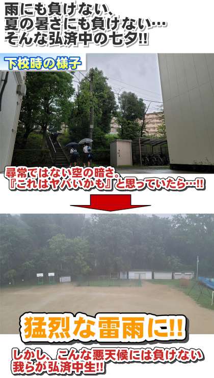 さて、そんな七夕の本日でしたが、残念ながら空は非常に暗く、特に夕方は激しい雷雨となるなど、決して天気には恵まれませんでした。しかし、そんな中でも、『雨にも負けず』、『蒸し暑さにも負けず』、弘済中生は、プールでの水泳授業や、教室での各教科の授業、あるいは放課後の生徒議会と、様々な取り組みをいつもどおり全力で頑張ってくれていました。