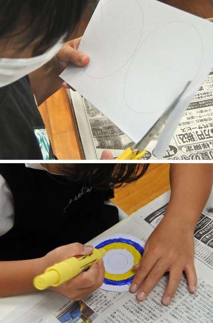 厚紙に直径10cmの円をかき、それを丁寧に切り取りました。