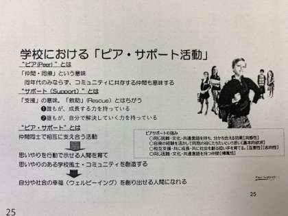 今日は立命館大学の菱田準子先生を講師にお招きして、教員対象の校内研修を行いました。研修の内容は「ピア・サポート」についてです。ピア・サポートは英語で「peer support」と書きます。意味は「仲間同士での支え合い」となります。そのために欠かせないのは、人とのかかわりです。より上手に人間関係を築き、仲間との共同・共感を活性化させるために、話の聞き方にスポットを当てて講義をして頂きました。