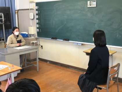 そんな昼下がり、中学1.2年生の教室からは授業での先生と生徒のやり取りが聞こえてきますが、中学3年生の教室だけは静かな緊張感に包まれています。2月に入るとすぐに私立高校の入試が始まります。その入試での面接試験の練習を行いました。「ドアは何回ノックするの?」「正しい座り方は?」「お辞儀の仕方は?」など、わかっているようでも、いざとなると「どうすればいいの?」と不安な表情を浮かべながら進路指導の担当の先生の話を聞いていました。