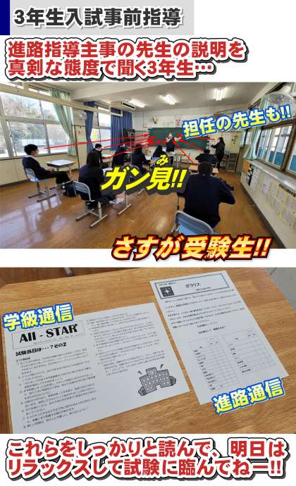 本校の3年生については、ほとんどの生徒が、人生初の受験ということで、『ワクワクドキドキ』や、『ドキドキ♥キュンキュン♥』どころではなく、『ドキドキ バクバク』!?レベルで緊張しているようです。