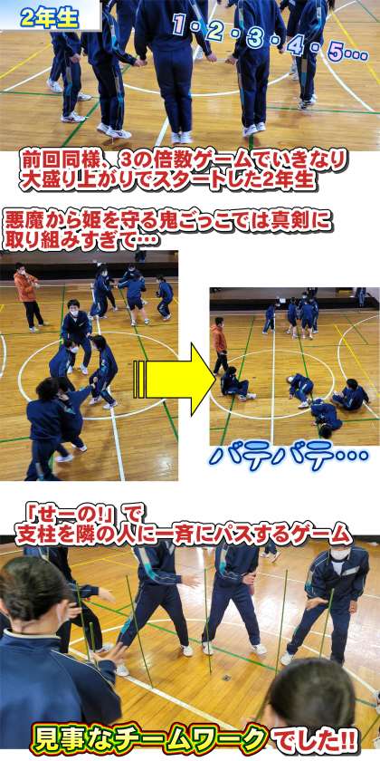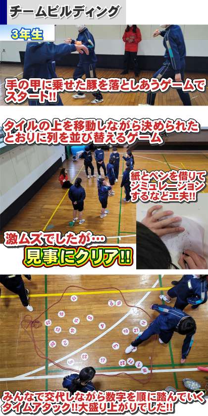 寒い時期だったからなのか、どの学年も、いつも以上に体をかなり激しく動かすプログラムが多く、運動が大好きな弘済中生だけに、ノリノリで大盛り上がりのチームビルディングとなりました!!