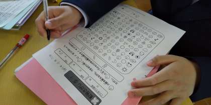 自分の感情にブレーキをかけられるように、認知機能の強化!コグトレの記号探しが行われました。時間内に集中して瞬時に記号を探していました。スタート時の際に先生が「みんなタイマー時計が鳴ってからペンをとってね」という声かけに対して、数名の生徒がペンを置く行為をためらうほど、集中していました。