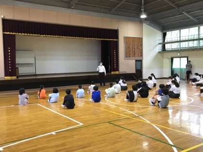 「私は、クーラーでよく冷えた部屋で脱水症状になり倒れてしまったことがあります。暑くないので、水分補給を怠っていたからです。その時の症状は、唇がカサカサになり、体がだるくなり、めまいがしました。微熱が出て食欲不振にもなりました。皆さんには、この症状が出る前に対策をしないといけないと思いますが、もし体に異変がでたら、すぐに報告してください。」と自らの経験談を交えた話に、児童・生徒は真剣に聞き入っていました。