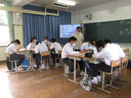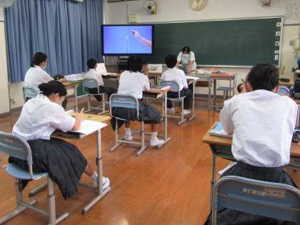 1年生の理科の授業では、大型テレビで写真や動画を見て、実験器具の使い方を勉強していました。手元が大きくうつされて、注意点が分かりやすかったです。