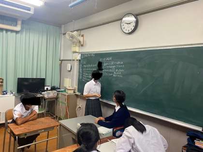 生徒会3名に、学級委員長、体育委員長、環境美化委員長、図書委員長の計7名で前期の振り返りをしました。