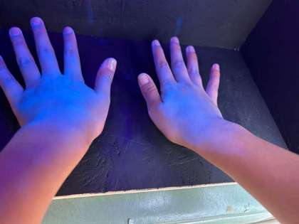 専用のチェッカー液を手に付けてブラックライトに当てると、