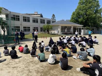 緊急放送が入ると同時に、安全確保のため廊下前に素早く整列して教室から移動しました。その後は、迅速に整列と人数確認をして運動場に避難しました。