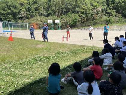 実際に先生方が消火器を使っている様子を子どもたちは集中して見ていました。