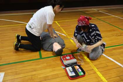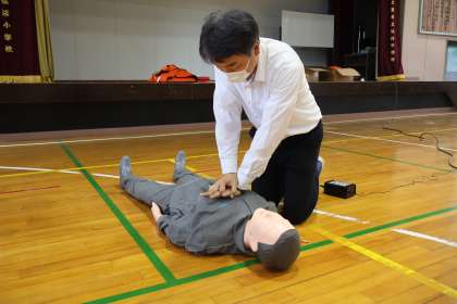座学では、教頭先生から応急手当の手順や心肺蘇生の手順を確認しました。AEDがあることで助かる命が増えるというお話がありました。