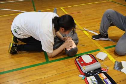 実技では、心肺蘇生法の実技を訓練用の人形を使用して行いました。