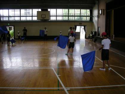 一人での動きでは、小さな子どもでも自分の身長に近いような長さの旗を振り回します。
