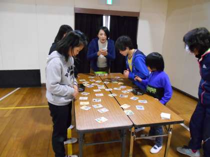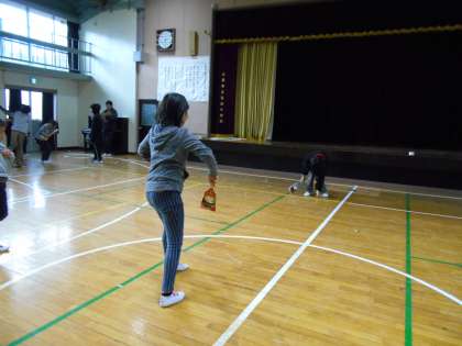 今年度は体育館全部を使う「すごろく」とコマ回し・はね遊び・かるたの4つです。