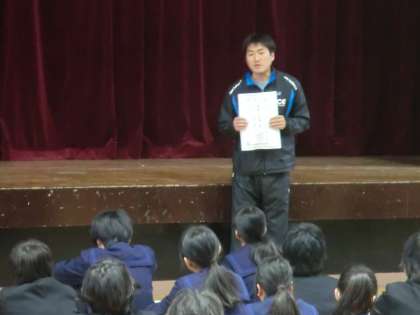 校長先生のお話に続いて、金野先生から今週の生活目標を発表して頂きました。今週の生活目標は「手洗い・うがいをしっかりしよう」です。「うがいをする時に、汚れた手でコップを持ったり、水を汲んでうがいをしてのではうがいの効果がなくなってしまう。だから手洗い、うがいの順番でやるんだよ」金野先生のお話にみんな「な〜るほど!」と納得するほど、とてもわかりやすく説明してくださいました。