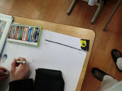 中学2年生は、はじめてアートセラピーの授業を行いました。お気に入りのクレヨンで1本線を自由に引き、それを好きなように分けて破ります。その2枚の紙にそれぞれ自由に絵を描き、その絵に自分の思いのまま色を塗っていきました。
