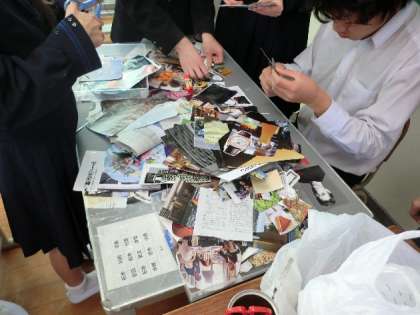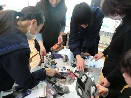 森すみれ先生から、中学3年生が2回目のレッスンを受けました。色々なポーズをした人間の姿をした画像に、クレヨンで色を塗りました。虹色に色を塗る生徒、真っ黒に塗りつぶす生徒と様々な人間を描いていました。その後、その人間の形を切り抜き、クラス全員の作品を一枚の紙に貼りました。