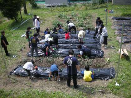 3日前の畑整備で草ぬきをしたとき以上に蒸し暑い中での作業でしたが、子どもたちは気持ちを切らすことなく一生懸命に畝を作り、マルチシートを掛け、野菜の苗を植えました。