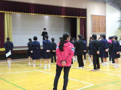 1月16日の生徒朝会では、校歌斉唱のあと、瀬崎先生より、体育館でのボールの使い方についての話がありました。