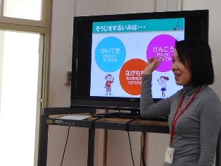 初めに、掃除の必要性ということで、「かいてき」「ながもち」「けんこう」という3つのキーワードでお話をしていただきました。特に1m位の高さにあるホコリが8〜9時間かけて地面に沈むことに、子どもたちは驚いていました。