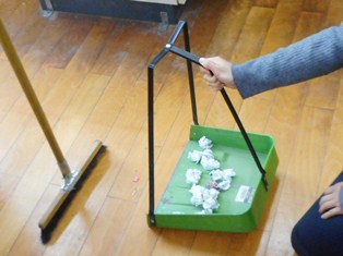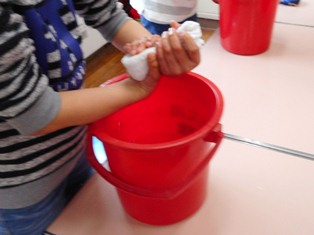 次に、掃除の仕方ということで、ほうきの持ち方、ちりとりの使い方、ごみの運び方、雑巾の拭き方・絞り方などを実演を通して教えていただきました。子どもたちは、しっかりごみが取れたり、雑巾が楽に絞れたりすることができたことに満足している様子でした。