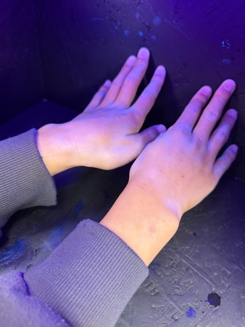 蛍光剤を手に塗布してブラックライトの箱の中に手を入れると、汚れている箇所が光り、手の汚れを可視化することができます。
