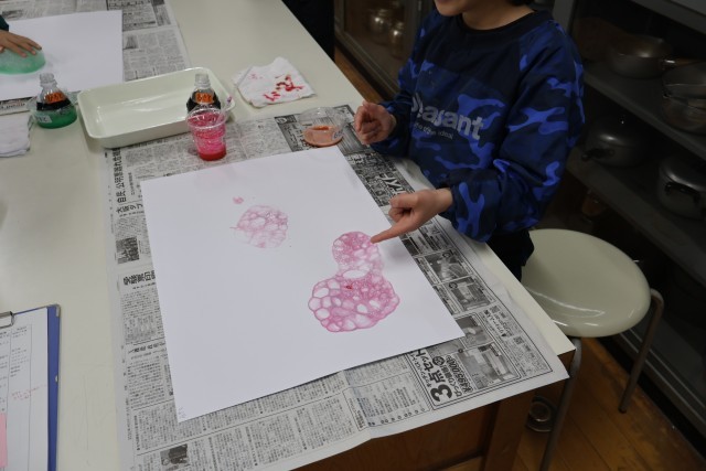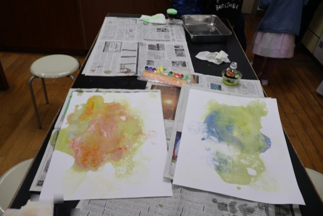 しゃばん玉に絵の具で色を付けて、泡がはじけた時のユニークな模様づくりをしました。