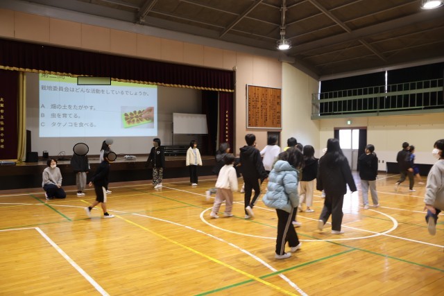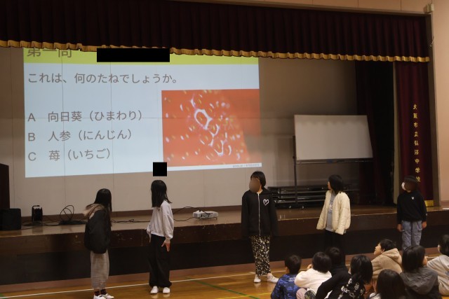 栽培委員会の活動や学校にある植物についてのクイズを行いながら、1年間の成果を紹介していました。