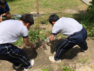 二日ぶりに見た菜園場では、児童が植えたトマトが大きく育っており、4時間目行われていた家庭科の時間では、他の児童と協力してトマトの支柱結びを行っていました。