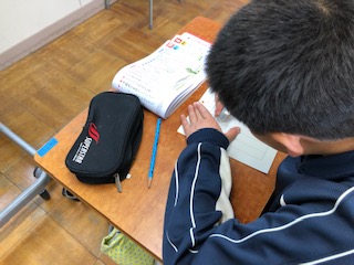 今回は「所々、自信がないな…」と朝からどこか弱気な声が聞こえてきましたが、書き取る鉛筆はスラスラと動いています。「あと1つここだけ分からない!!!」と悔しさが残りつつも時間が来てしまいました。次の小テストは満点目指して頑張ってほしいものですね。