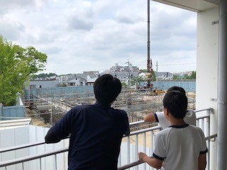 ただ今学校では、本館の建て替え工事を行っているため、教室の外へ出て、日本の工業との違いや気づきなどを工事の様子を見つつ、生徒たちも考えていました。