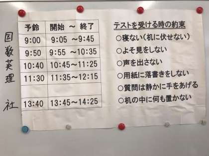 本日、1時間目から5時間目に中学3年生は実力テスト、2年生・1年生は課題テストが行われました。試験前は不安そうな表情をしていましたが、テストが始まると最後まで集中して取り組む姿が見られました。