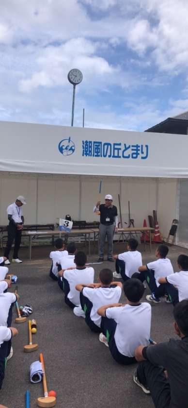 潮風の丘とまりでグラウンドゴルフの体験です。元気もよく風が気持ち良いです。生徒も楽しく、はじめての体験を満喫しています。